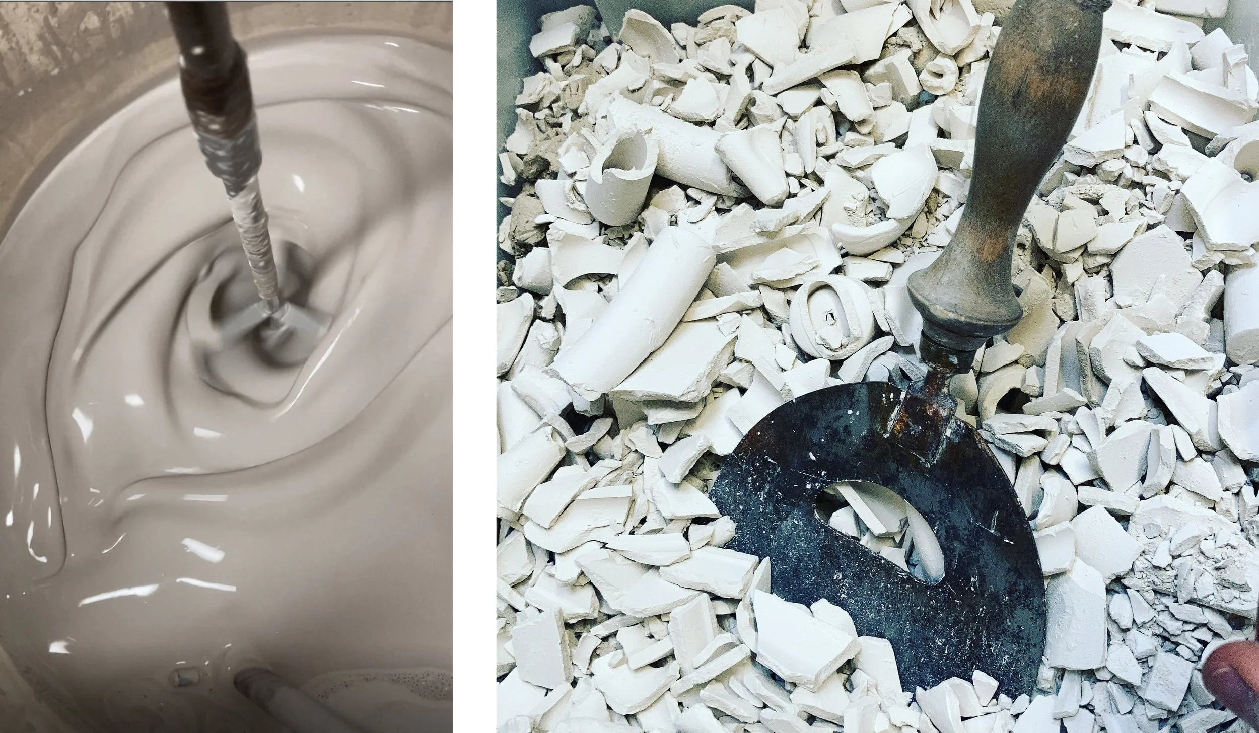 Vi använder leran både i form av gjutmassa (flytande) och som plastisk massa (icke flytande). I båda fallen blandar vi först till en slamma av vatten och spraytorkad lera. Slamman kan sedan användas som gjutmassa eller pumpas in i en filterpress och sedan gå igenom en lerkvarn för att skapa en plastisk massa.
